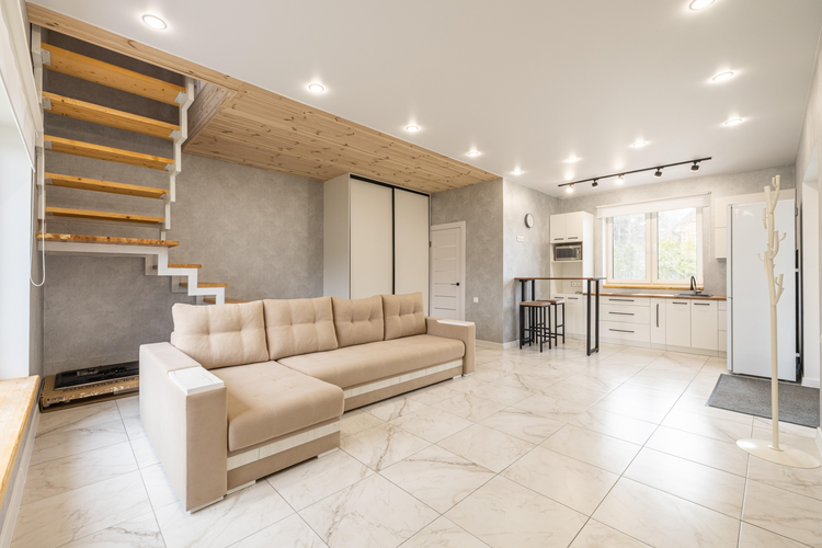 первый этаж: просторная гостиная с кухней — идеальное место для семейных ужинов и приёма гостей;