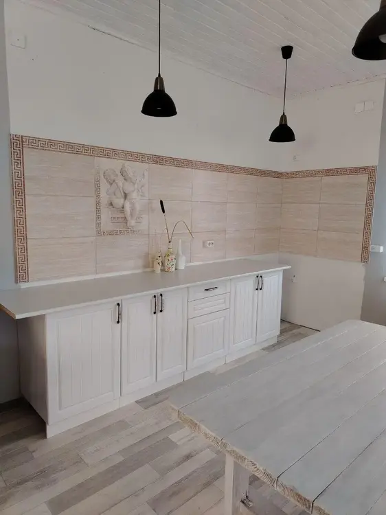 Между стенами и стяжкой - демпферная лента (для сохранения прочности и предотвращения трещин). Под каждым углом под фундамент залиты бетонные быки, чтобы по фундаменту не было трещин. Санузел, новая кухня и шкафы. Крыша - ондулин, утеплена минеральной ватой (утепление). К летней кухне есть пристройка, которую можно использовать как гараж.