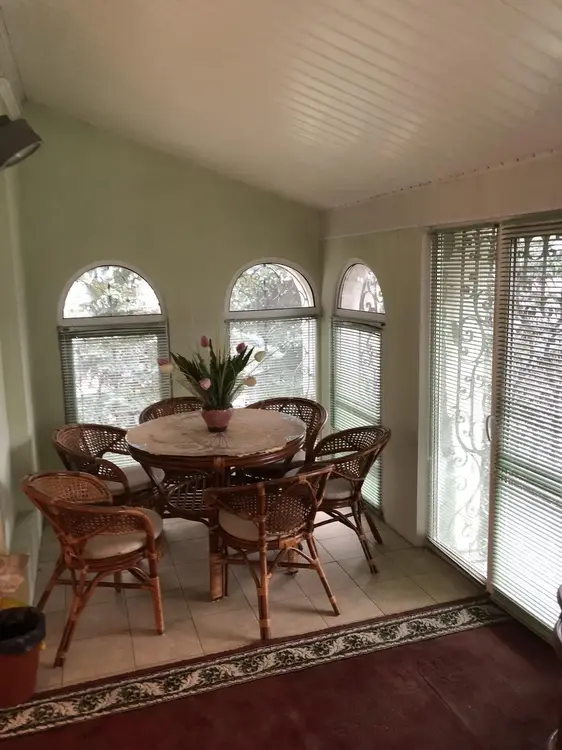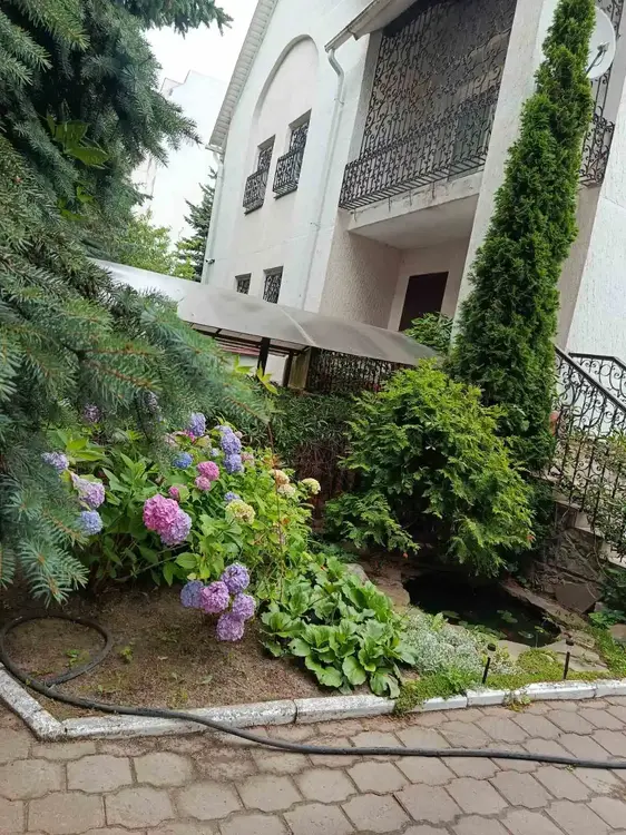 На участке (10,4 сотки) выполнен ландшафтный дизайн. Есть зона барбекю, застекленная беседка, гараж, пруд с водопадом и золотыми рыбками. Большое количество хвойников (голубые ели, туи), кустарники, цветы. Участок огорожен кованым забором и живой изгородью из туй по всему по периметру, ворота с электроприводом. Установлено видеонаблюдение по всему периметру участка и дома. Декоративная надежная ковка на всех окнах.