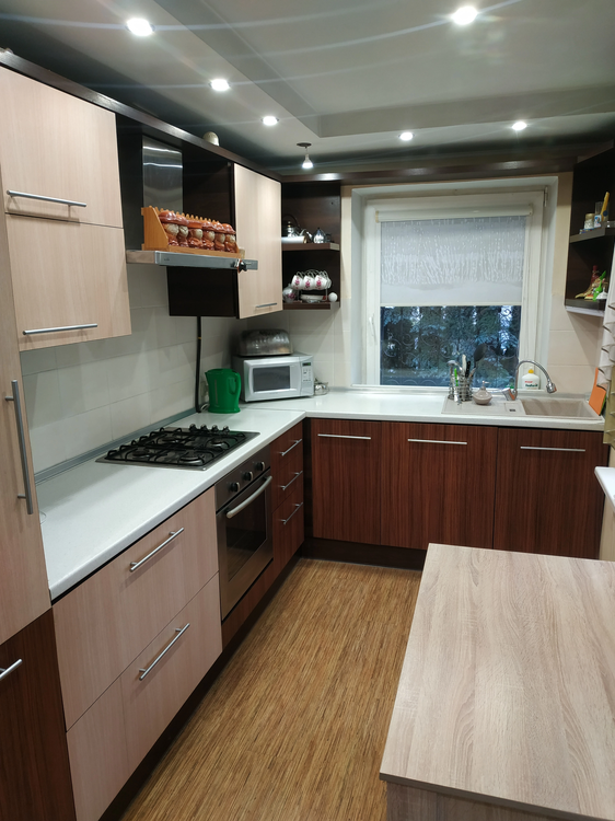 На первом этаже располагается большая гостиная с камином на дровах- (30 кв.м)+столовая(10 кв.м)+кухня(10 кв.м). Кухня оборудована встроенной имп.быт.техникой (газ.панель, дух.шкаф, холодильник, посудомоечная машина).