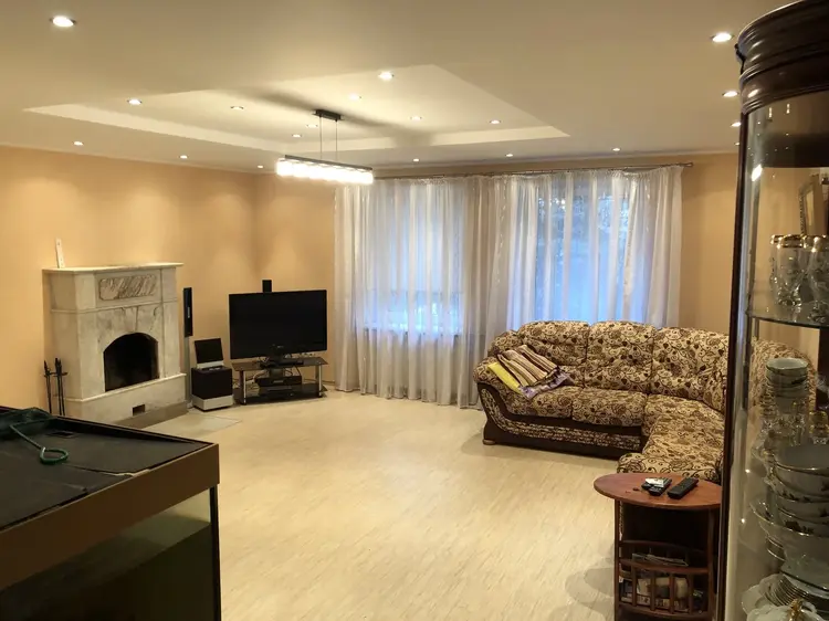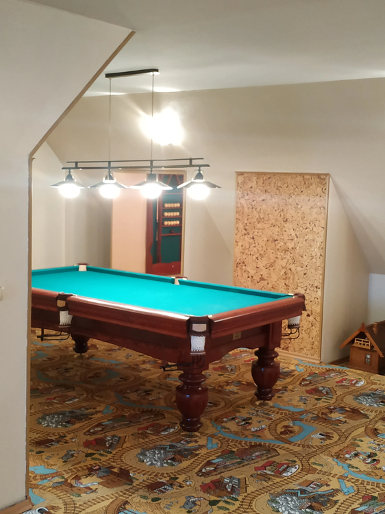 На втором этаже- 2 жилые комнаты (по 16кв.м) и спальня(25кв.м) с большой террасой. На третьем этаже-оборудованная бильярдная (50кв.м). В доме 3 санузла с джакузи и душевой кабиной. В цокольном этаже расположены баня с парилкой, бассейном и комнатой отдыха, прачечная, гардеробная, кладовая, котельная,санузел.