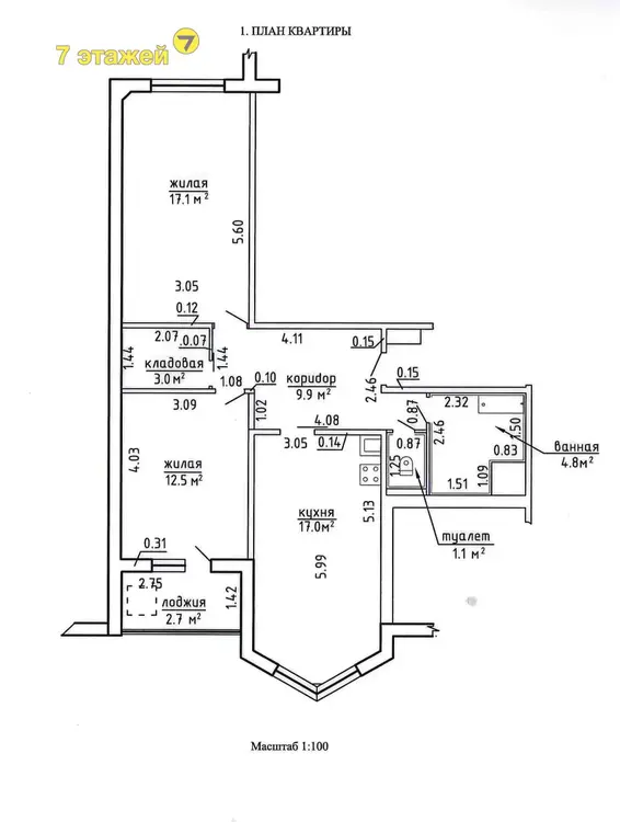 Площадь по СНБ 68.1 м.кв, общая 65.4 м.кв. жилая 29.6 м.кв, кухня 17 м.кв.