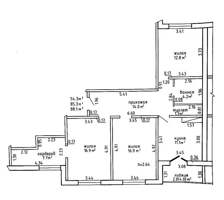 Расположена квартира на 4-м этаже одиннадцатиэтажного панельного дома 2023 года постройки. Общая площадь квартиры составляет 88.1 м2 по СНБ