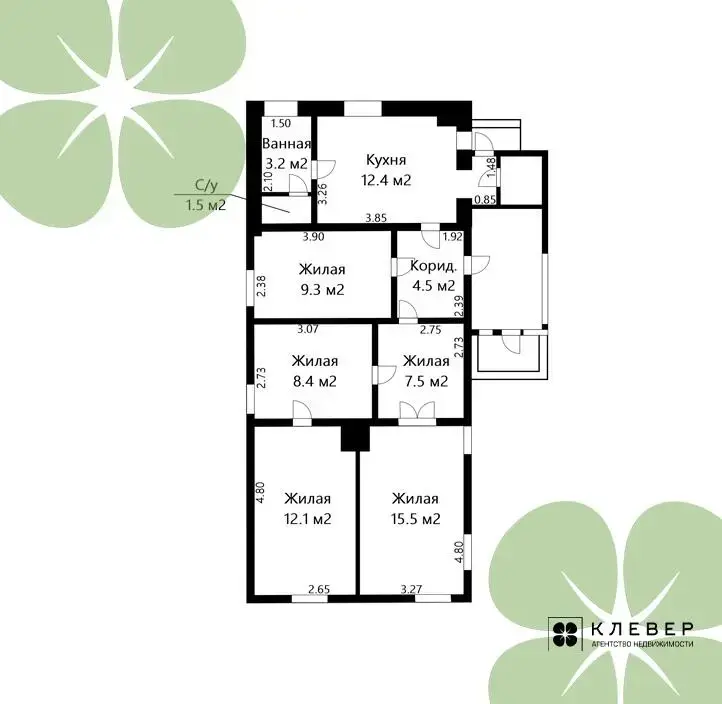 Комнаты: 15,5 м2; 12,1 м2; 9,3 м2; 8,4 м2; 7,5 м2.
