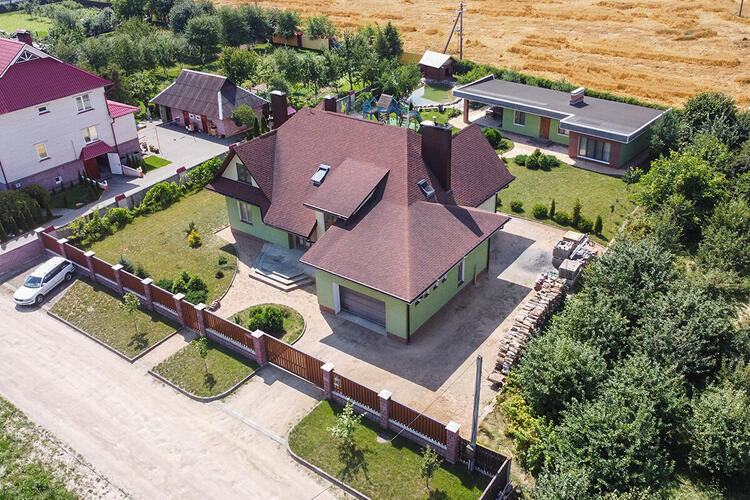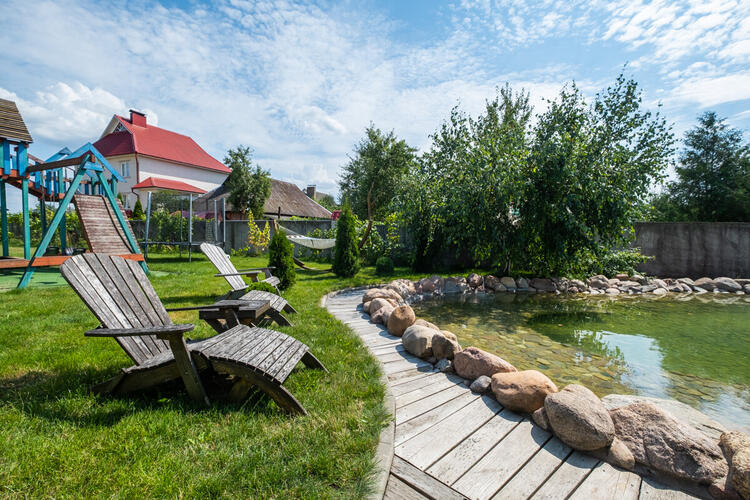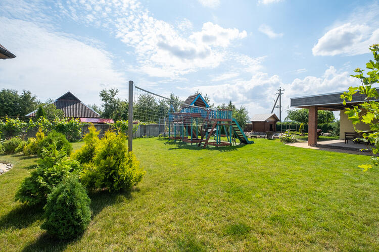 На участке с домом растёт сортовой виноград и ягодные кустарники. На всей территории выполнен ландшафтный дизайн. Под газонным покрытием уложена сетка для кротов. По периметру дома и по всему участку установлены ливневки. Во дворе есть дизайнерский бассейн-пруд с очистительной системой, рядом место для барбекю, детская игровая площадка, открытая терраса и баня с внутренним бассейном -в настоящее время используется, как гостевой дом, полностью меблированный, отапливаемый, со всеми удобствами и коммуникациями, готовый для круглогодичного проживания на период проведения ремонтных работ в доме.