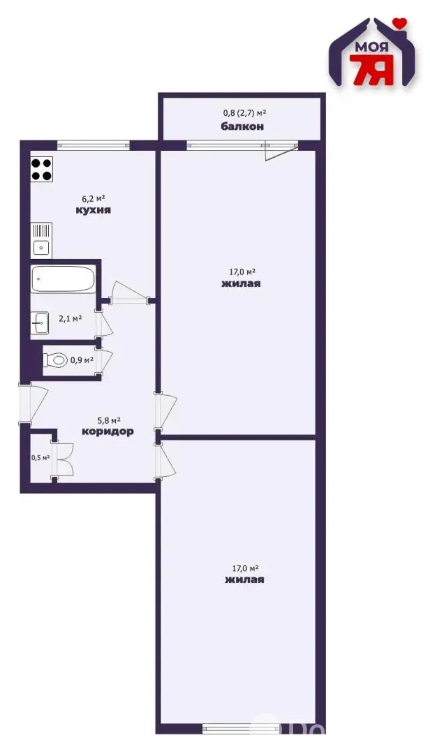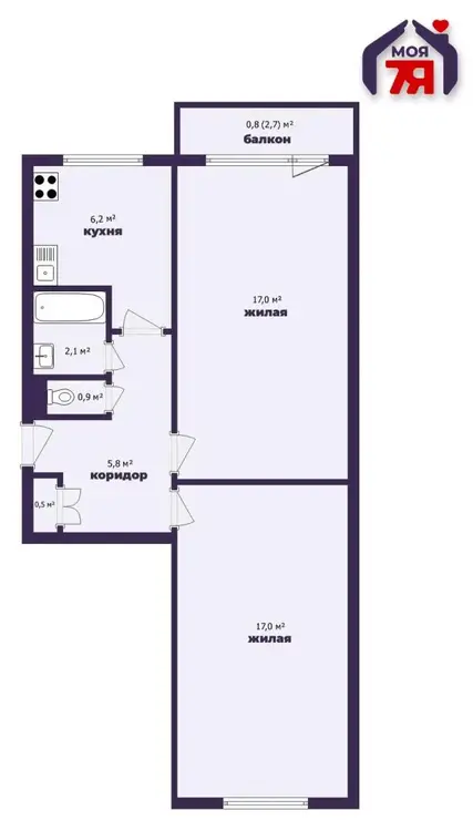 - Общая площадь квартиры составляет 49,5 м².