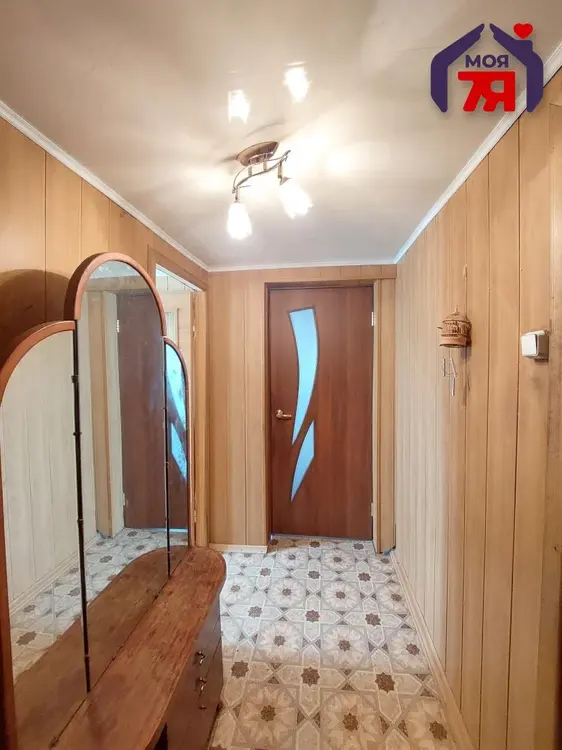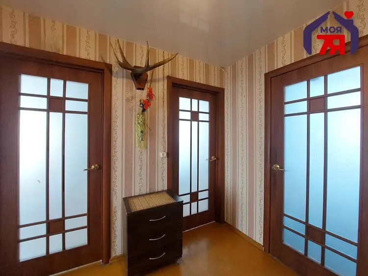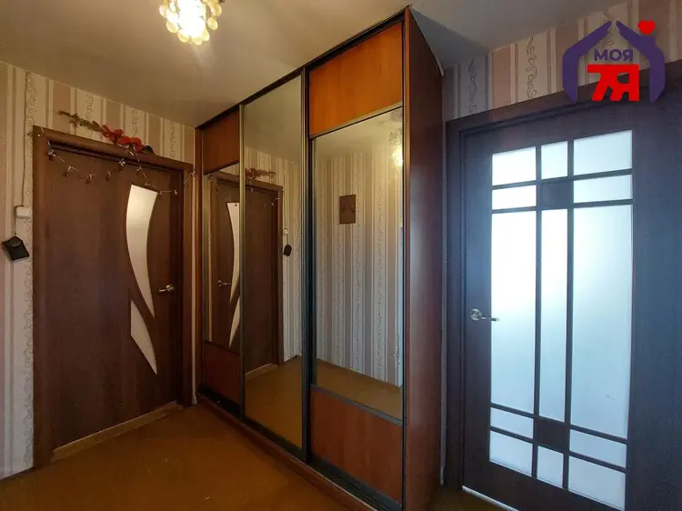 -Прихожая функциональна и практична: установлен вместительный шкаф-купе с зеркальными фасадами, который решает вопрос хранения и визуально расширяет пространство. Межкомнатные двери выдержаны в едином стиле, с остеклением - интерьер выглядит цельным и светлым.