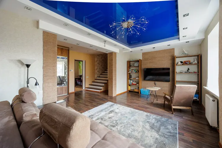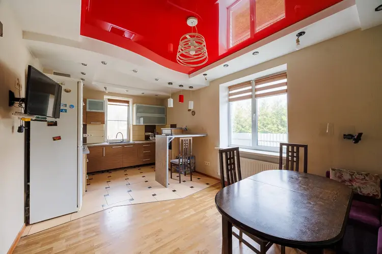 При внутренней отделкеиспользовали материалы высокого качества. На полу уложен ламинат высокого качества и керамическая плитка. Стены выровнены и оклеены обоями. Потолок двухуровневый с дополнительным освещением.