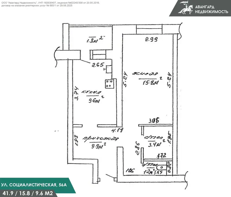 Однокомнатная квартира с улучшенной планировкой. Площадь по СНБ 41,9м2 находится на пятом этаже из пяти. Есть технический этаж (полноценных 2 два пролета). Скатная крыша. Жилая комната правильной формы, площадью 15,8 м2. Просторный коридор площадью 9,9 м2. Кухня площадью 9,6 м2 с выходом на лоджию, площадью 3,6 м2.Совмещенный сан/узел. Высота потолка 2,55 м.