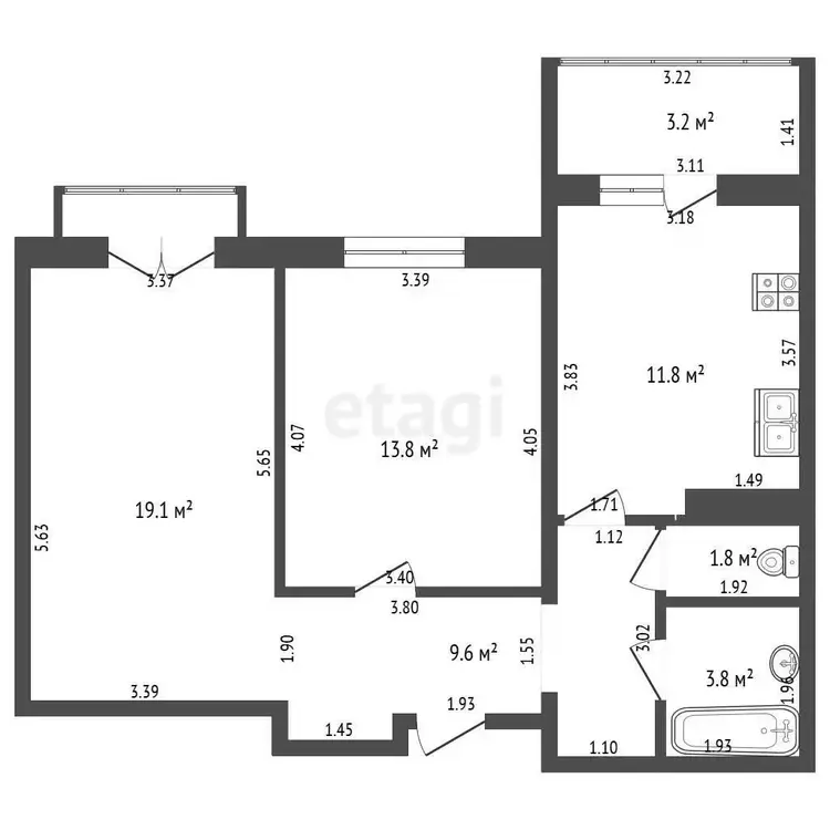 • Общая площадь: 67.4 м2 (по СНБ – 72.7 м2), жилая 34.7 м2, кухня 12.2 м2, лоджия 7.5 м2.