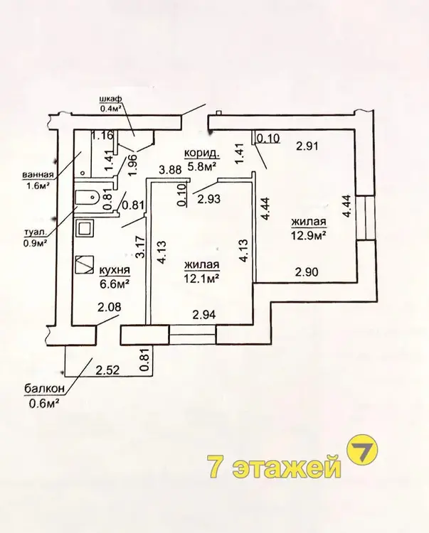 В квартире две равноценные изолированные жилые комнаты (12,1 и 12,9 кв.м.) Кухня 6,6 кв.м имеет выход на застекленный балкон. Туалет и ванная раздельные, облицованы плиткой. Установлены счетчики воды. На окнах установлены современные стеклопакеты. На потолках декоративная плитка, на полах линолеум. Входная дверь металлическая. Имеется охранная сигнализация. Мебель по договоренности. Парковка во дворе дома.