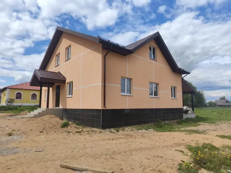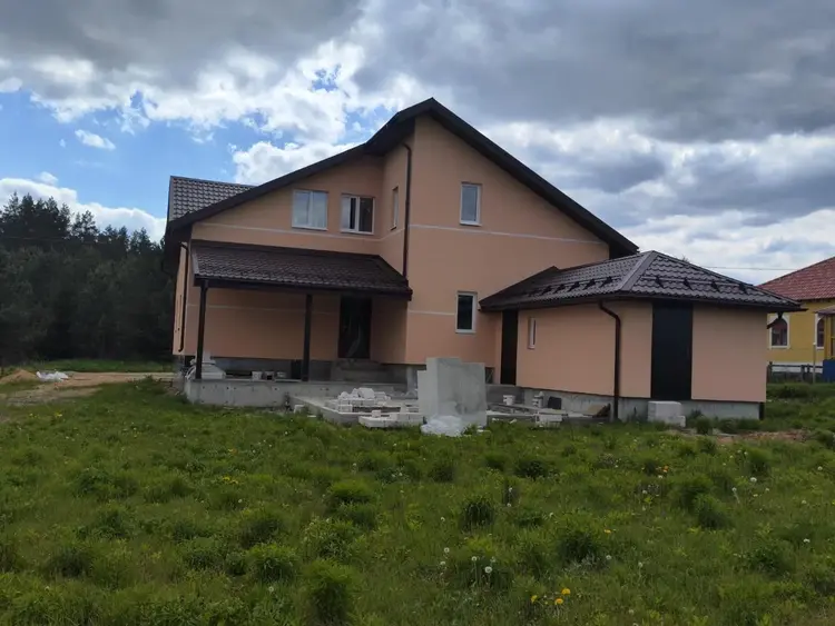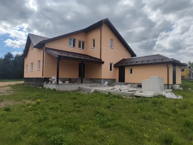 Построен добротно из газосиликатных блоков 40 см, утеплён (Paroc) 5 см, оштукатурен снаружи. Крыша металлическая черепица, фундамент отделан натуральной гранитной плиткой, стеклопакеты ПВХ; теплые полы на первом этаже, кроме спален; оборудована котельная, без отопительного котла; входные 2 двери металлические.