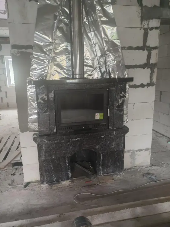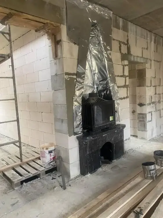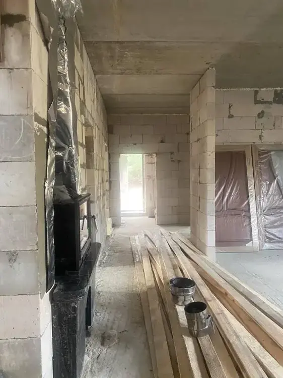 Сейчас ведутся работы: завешается отделка фундамента плиткой, делается отмостка по периметру здания, далее штукатурка стен внутри дома, установка дверей и наличников( имеются в наличии), полностью завершается отделка камина с выводом дымохода на крышу.