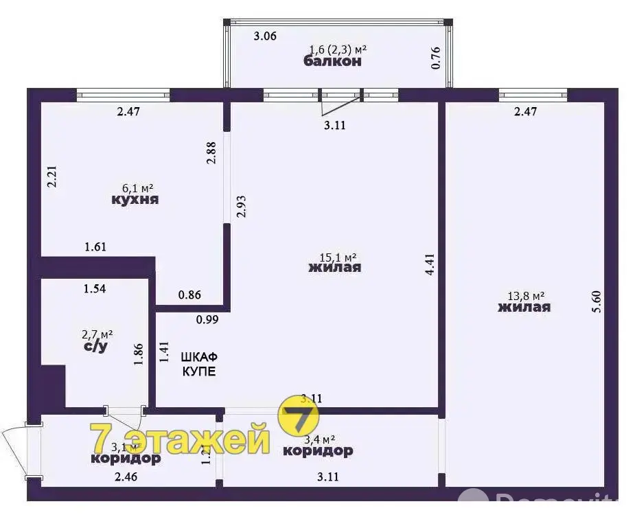 Площадь общая по СНБ 45,8м2; общ.пл. 44.2м2, жилая комната 1 – 15,1м2; жилая комната 2 – 13,8м2; небольшая кухня – 6,1м2, высота потолков 2,56 метра.