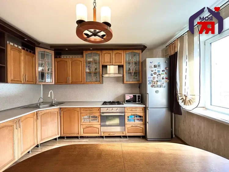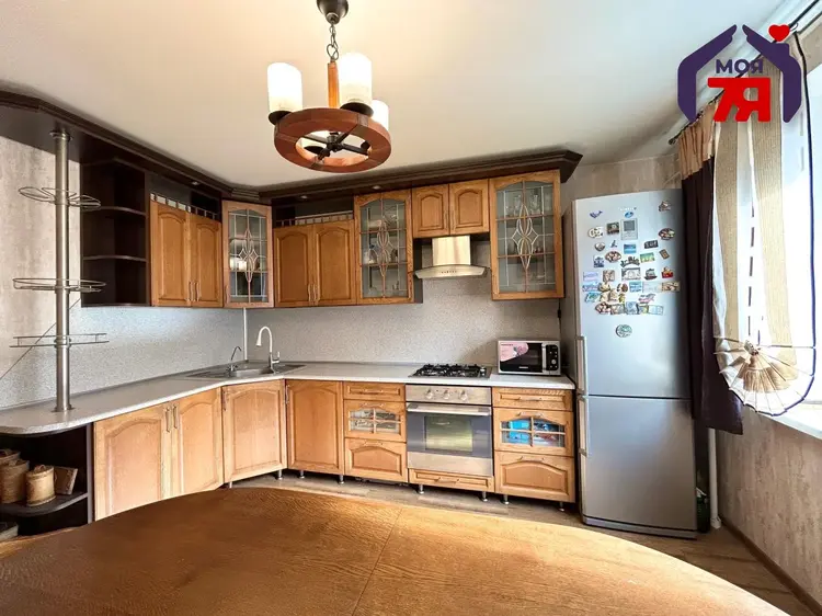 - Особое внимание заслуживает кухня, ее площадь составляет 12,7 м2. Качественный кухонный гарнитур c бытовой техникой позволит вам с удовольствием готовить и принимать гостей. Кухня из массива и бытовая техника остается новым владельцам.