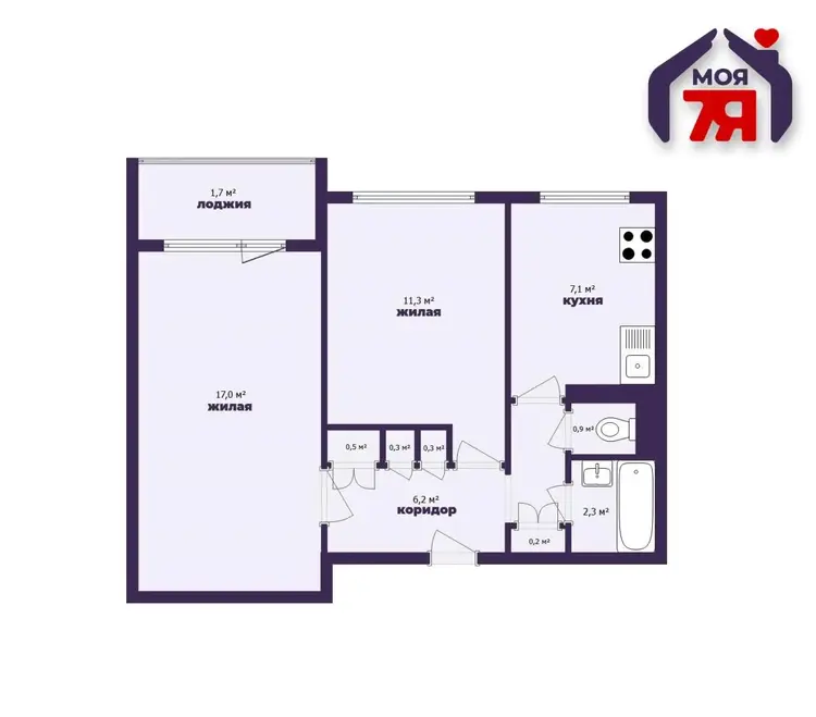 - Две раздельные комнаты площадью 17,0 м² и 11,3 м², что позволяет каждому члену семьи иметь личное пространство. Из большей комнаты открывается выход на застекленную лоджию — идеальное место для отдыха и хозяйственных нужд.