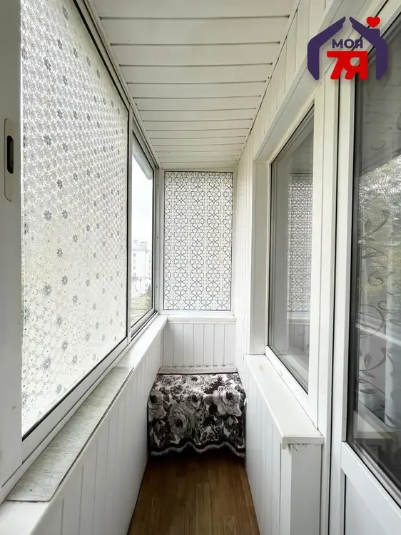 - Из жилой комнаты есть выход на застекленный балкон. Установлена алюминиевая рама, балкон обшит сайдингом.