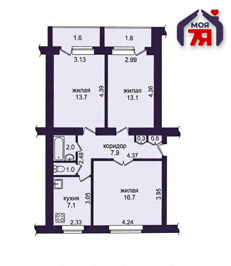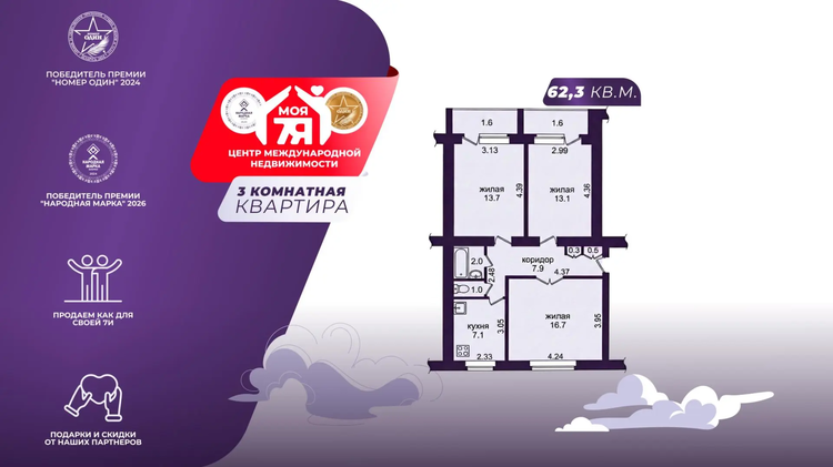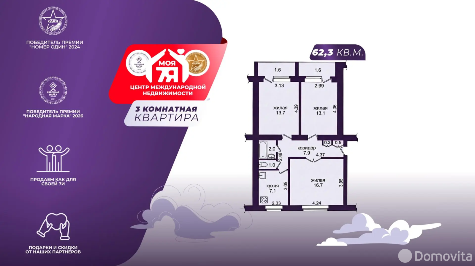 Общая площадь квартиры составляет 62,3 м². 3 изолированные жилые комнаты 16,7 м², 13,7 м² и 13,1 м², а также вместительная кухня 7,1 м².