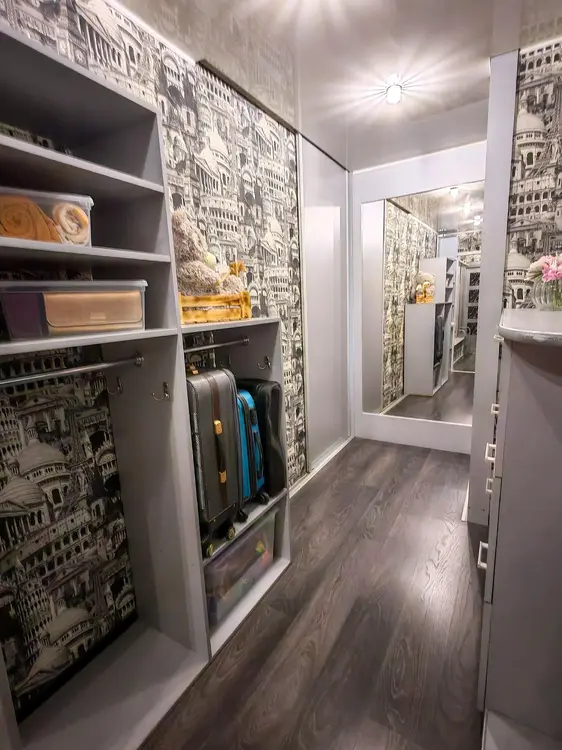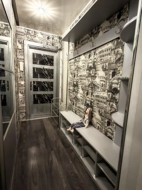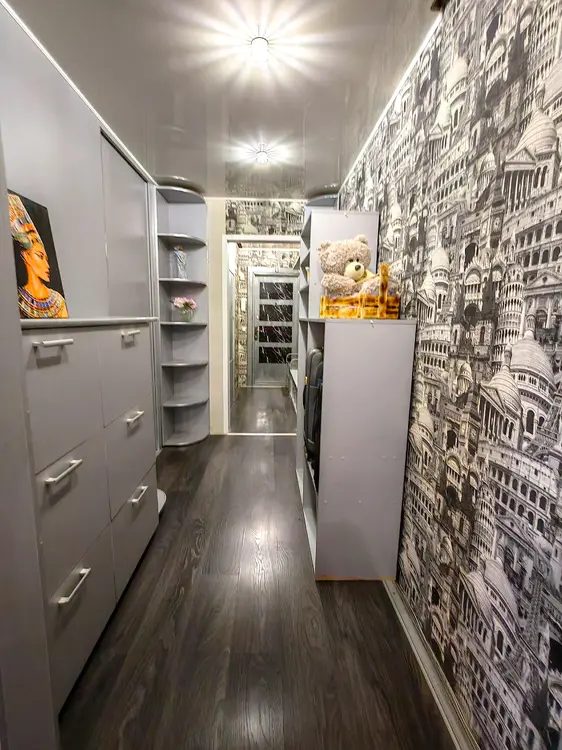 Большой коридор с удобными местами хранения, где много полок, вешалок, комодов и свободного пространства. Все межкомнатные двери заменены на современные и удобные двери-купе, которые не занимают площадь в квартире. Установлены окна ПВХ. Потолки натяжные с встроенными светильниками и люстрами, кроме детской комнаты и ванной. На полу уложен качественный ламинат, плитка и теплый линолеум.