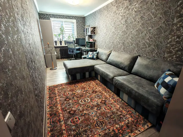 Роскошная гостиная с выходом в кухню с кухонным оборудованием и выходом на балкон! Обустроена зоной отдыха: большим угловым и удобным диваном с зоной ТV. Установлен кондиционер с функцией охлаждения и подогрева воздуха. Выходя на балкон любуешься панорамным видом на город. Установлена новая раздвижная алюминиевая рама, заменена балконная крыша с козырьком.