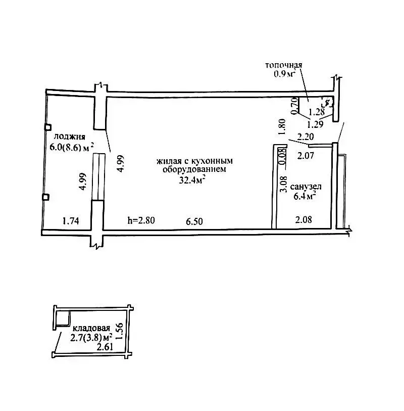 Высокие потолки 2.8м.