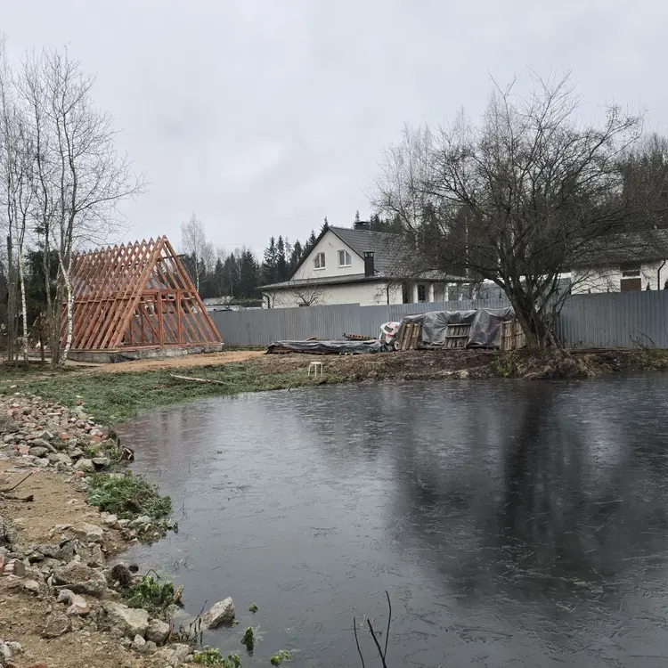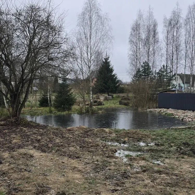 На участке огромный глубокий пруд с рыбой,канадский клен у пруда и другие деревья.