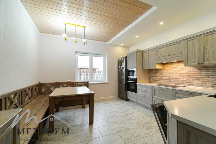 Фундамент - утепленная плита. Материал стен - газосиликатный блок, утеплитель - мин.вата фасадная. Кровля – гибкая черепица "Katepal". Газ центральный, вода (центральная от круглогодичной скважины СТ). Канализация местная.