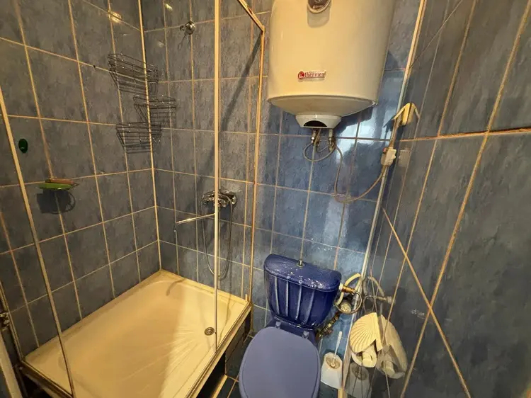 В санузле установлен бойлер для нагрева воды. Стены облицованы керамической плиткой.