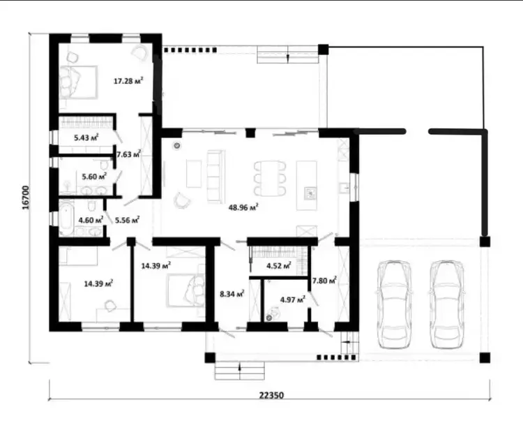 - Общая площадь дома по СНБ – 245 м2 (кухня-гостиная 50м.кв, 3 спальни, 2 санузла, 2 гардероба, постирочная, терраса 80 м2 (возможна корректировка площади)).