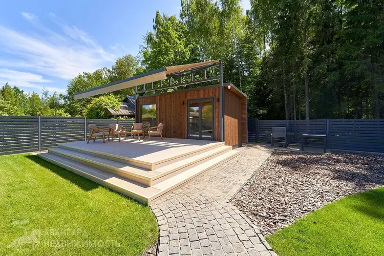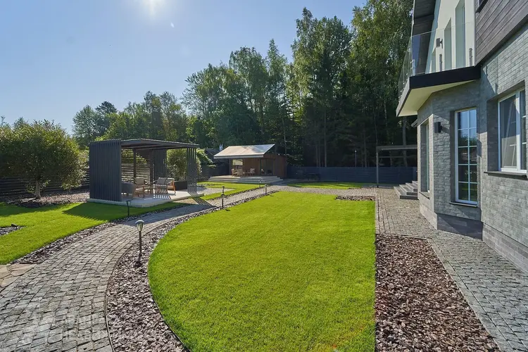Большой облагороженный земельный участок площадью 17.5 соток с газоном и ландшафтным дизайном в частной собственности. На участке расположены дом с навесом-террасой, беседка, навес на два авто с хозблоком, баня и вольер. Участок огорожен забором, по периметру множество декоративных растений и насаждений, организовано повсеместное освещение, въездные откатные ворота открываются с пульта. Калитка с видеодомофоном. Участок угловой, граничит с лесом, тупиковый заезд, полное отсутствие транспортного трафика на прилегающей облагороженной территории(на въезде установлен шлагбаум, размещены современные фонарные столбы с датчиками движения, асфальт до участка).