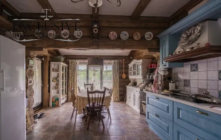 Стены основного дома из отборного бревна диаметром 35-45 см, крыша из глиняной немецкой черепицы.