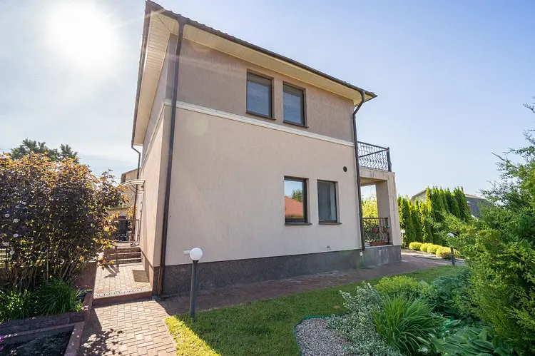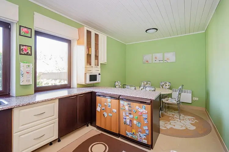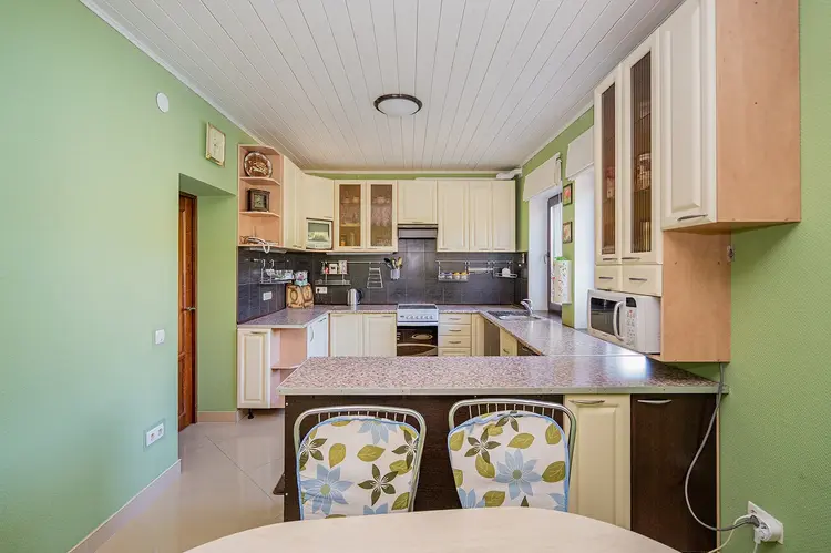 Основной дом - здание 10*12.1 метров, площадь 121м2. Фундамент – монолитный. Стены - блок газосиликат + термошуба. Крыша – металлочерепица. Электричество - 2 фазы 220/380 Вт. Отопление в доме – электрическое – французкие электробатареи. Вентиляция – естественная приточно-вытяжная. Оборудование в доме – электроплита, вытяжка, два холодильника, камин, печь.На первом этаже расположены прихожая, гостиная и кухня столовая. На втором этаже - четыре спальни, одна их которых с террасой.