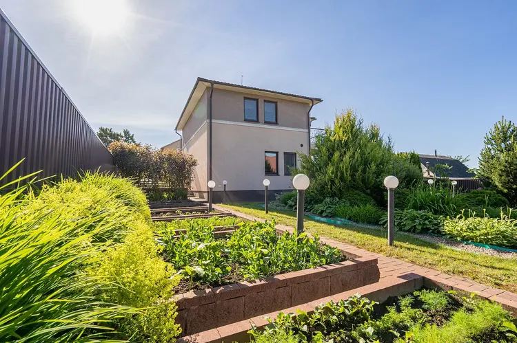 Участок разделен на четыре зоны: сад, клумба, зона для бассейна и отдыха, зона барбекю, зона грядок.