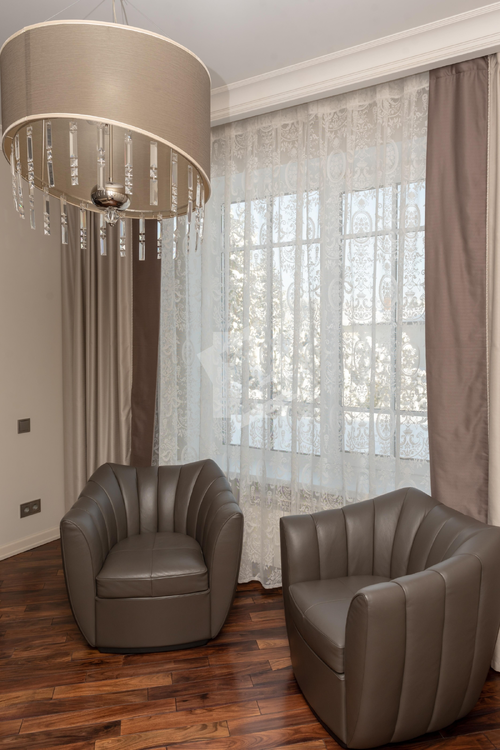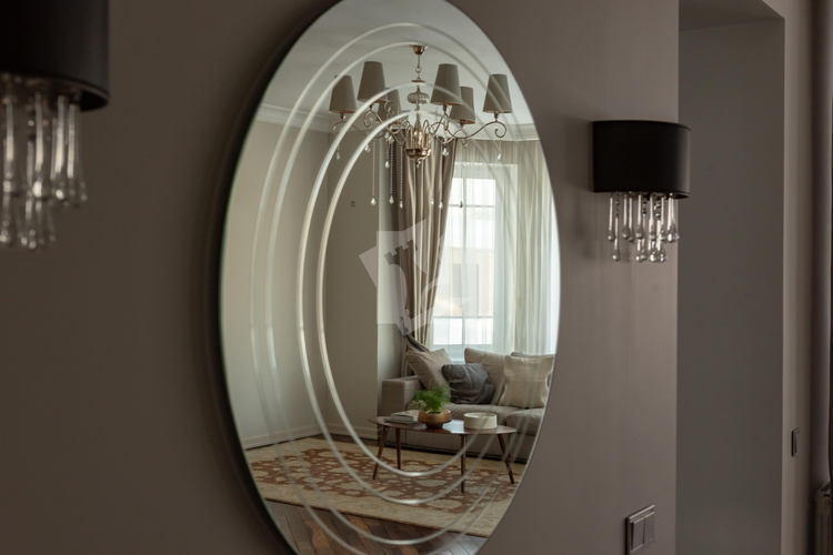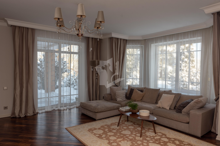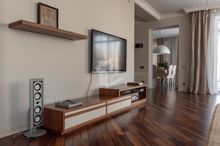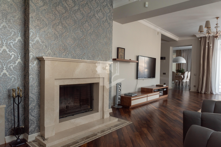 Лестница с настоящей художественном дизайнерской ковкой и межкомнатные двери выполнены на заказ по индивидуальным эскизам из теплого и долговечного массива ясеня, полы из экзотических твёрдых пород бамбука и палисандра.