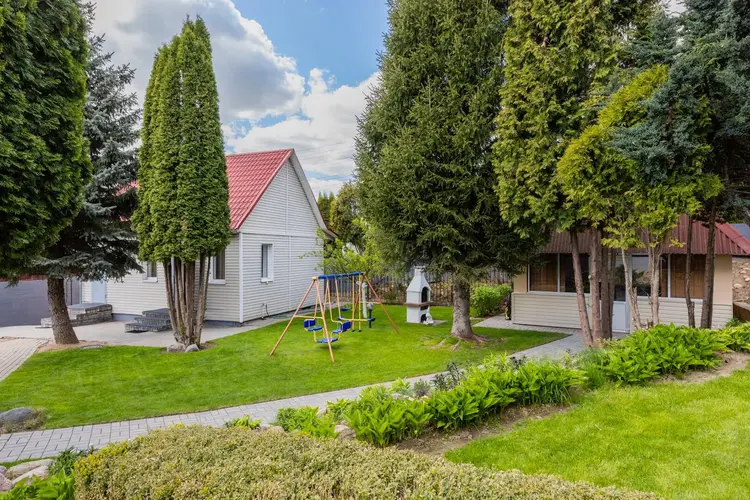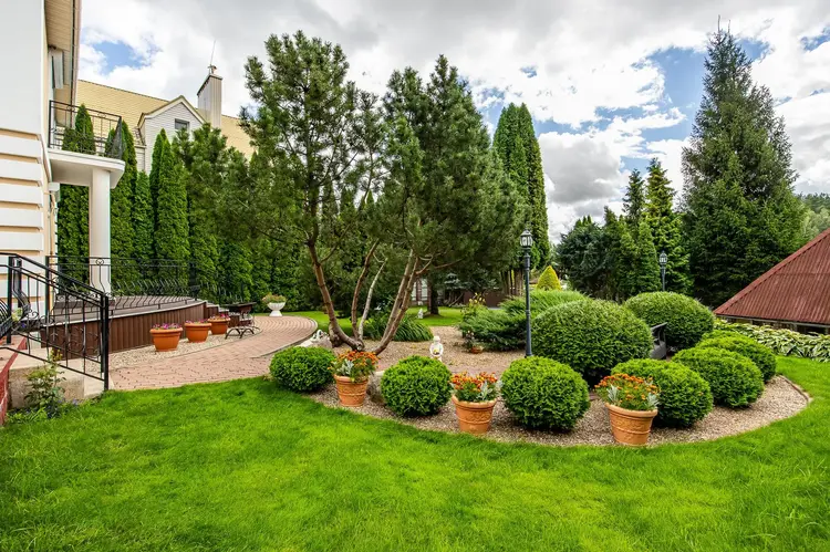 -Просторный участок с зелеными насаждениями: высокие туи, голубые ели, декоративные кустарники