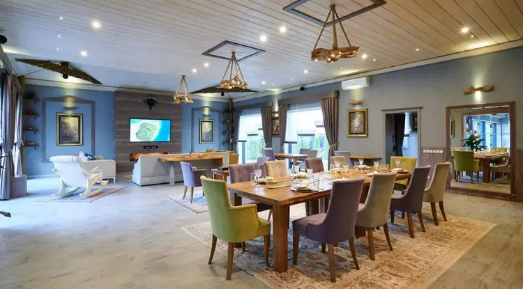 - уютная гостиная -117,7 м2,оборудована обеденной группой и зоной отдыха,вся мебель премиум-класса выполнена на заказ.Установлен биокамин для уюта и тепла.Гостиная украшена эксклюзивными элементами интерьера.