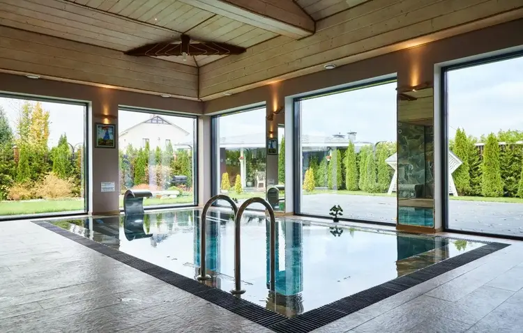 - просторная SPA- зона -74,5 м2,с бассейном 3х6 м. с каскадным водопадом,гидропушками,турецким хамамом с эффектом глубокого прогрева .Современная вентиляционная система и осушитель воздуха.Благодаря высоким потолкам и большим окнам в зоне отдыха всегда много дневного света.