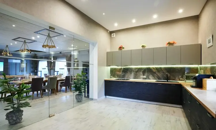 - кухня -19.5 м2, полностью оборудованная, премиум-техника Bosch,зонирована стеклянной перегородкой.Рабочая зона расоложена вдоль стены ,а так же оснащена окном,с естественным освещением.