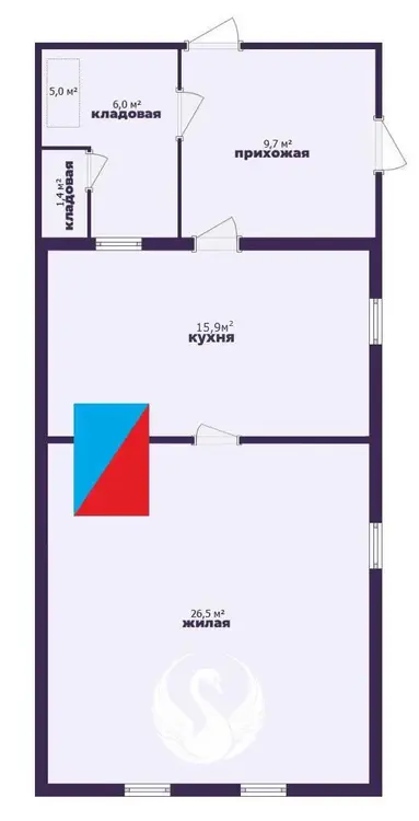 - Общая площадь дома - 59,5 кв.м,, жилое пространство - 26,5 кв.м., кухня - 15,9 кв.м.
