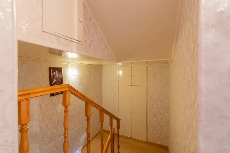 Лестница на второй этаж широкая, что позволяет с комфортом передвигаться по дому.