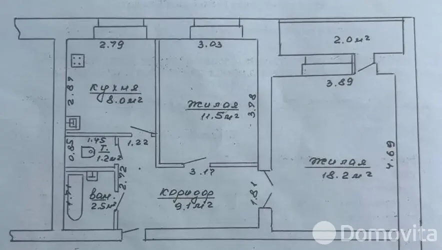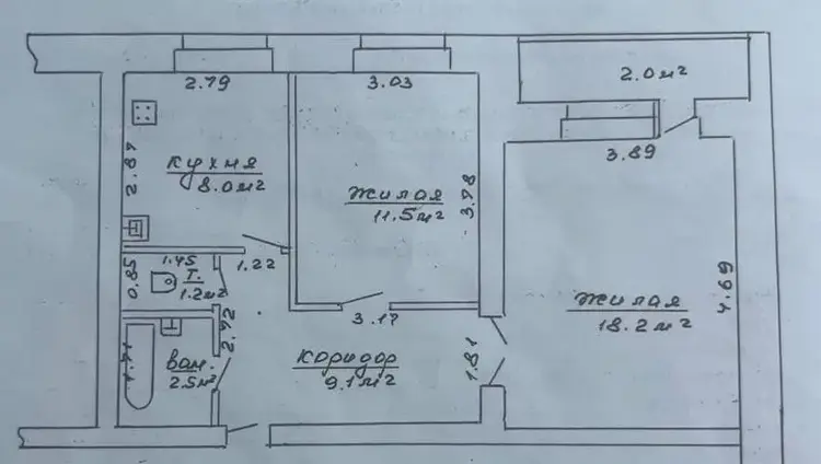 • Общая площадь коридора — 9 кв. м., кухня — 8 кв. м.;