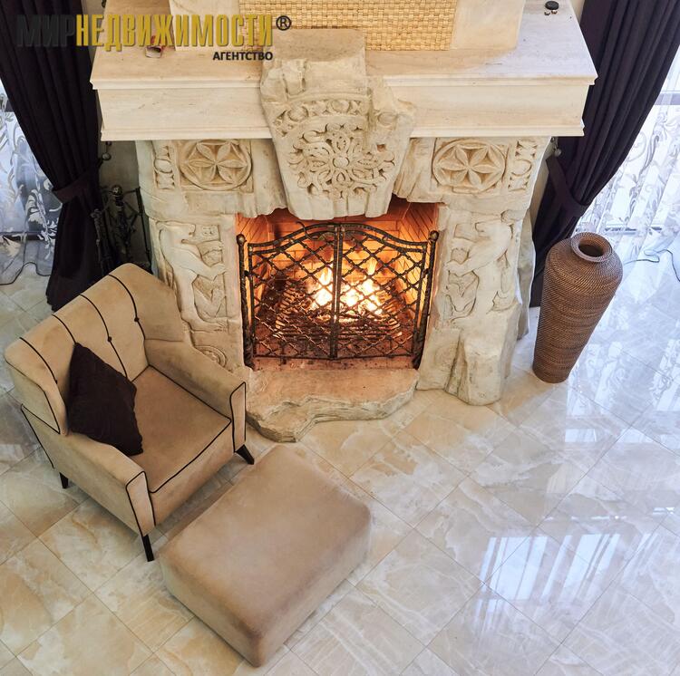 - кухня с большой обеденной зонной 30,1 кв.м., гостиная 42,4 кв.м. с выходом на террасу. В гостиной второй свет и большой камин открытого типа. Терраса с навесом, открытая, большая печь для барбекю;