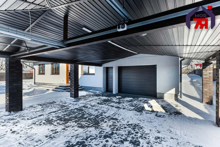 - Оборудован просторный гараж и навес на 2 автомобильных места с подъемными воротами Алютех. В гараже встроенное стеновое электроотопление.