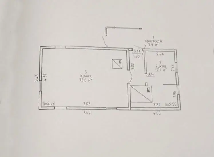 Дом размерами 7,5х11,5 состоит из двух частей – большой комнаты 33,6 кв.м. с печкой и кухонной зоны с большой печью, также есть прихожая в небольшой пристройке. Перекрытия, полы, окна и двери из дерева, крыша - шифер.