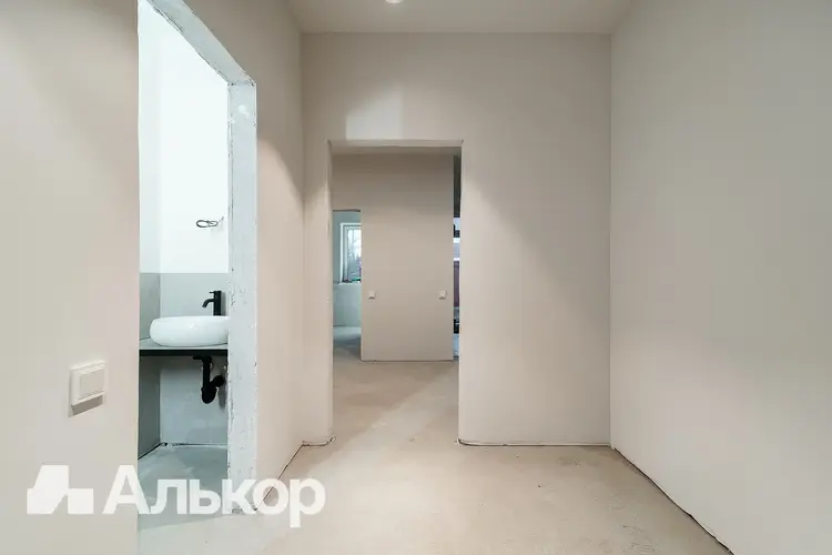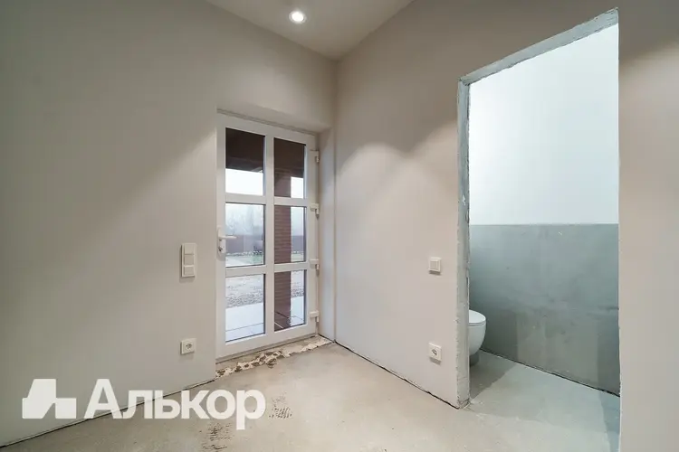 По периметру первого этажа установлен теплый пол. Размещаются просторная гостиная, совмещенная с зоной кухни, 2 спальни,2 санузла, хозблок, есть небольшой подвал. Стены окрашены, потолок натяжной матовый.