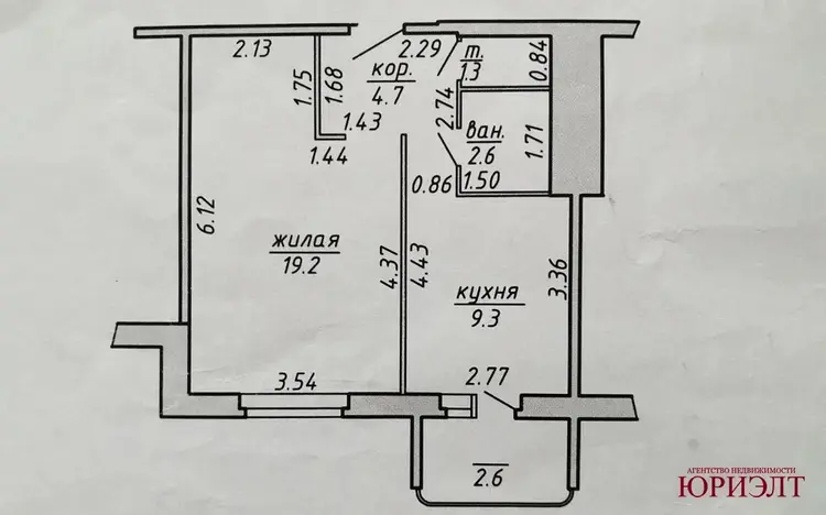 Общая площадь 37,1 кв.м., жилая19,2 кв.м., кухня 9,3 кв.м.