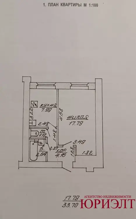 Квартира общей площадью 33,7 кв.м., кухня 8,0 кв.м. Санузел раздельный. Окна ПВХ.