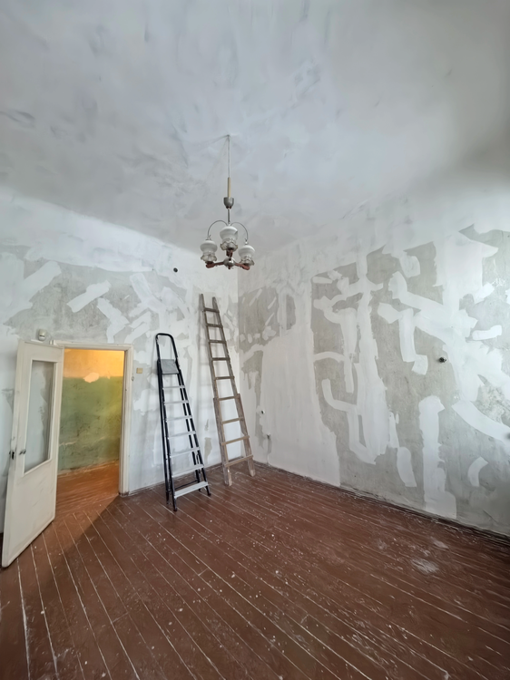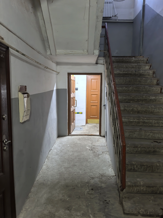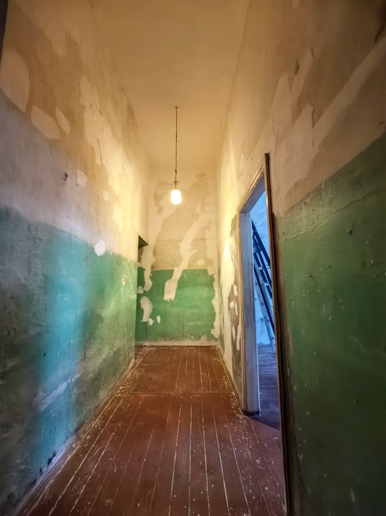 Общая площадь - 38.07 м2, жилая - 17.35 м2. Потолки 3.5 метра. Стены - 60см. Второй этаж. Санузел раздельный.