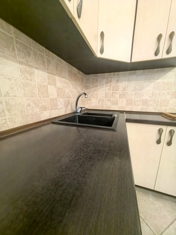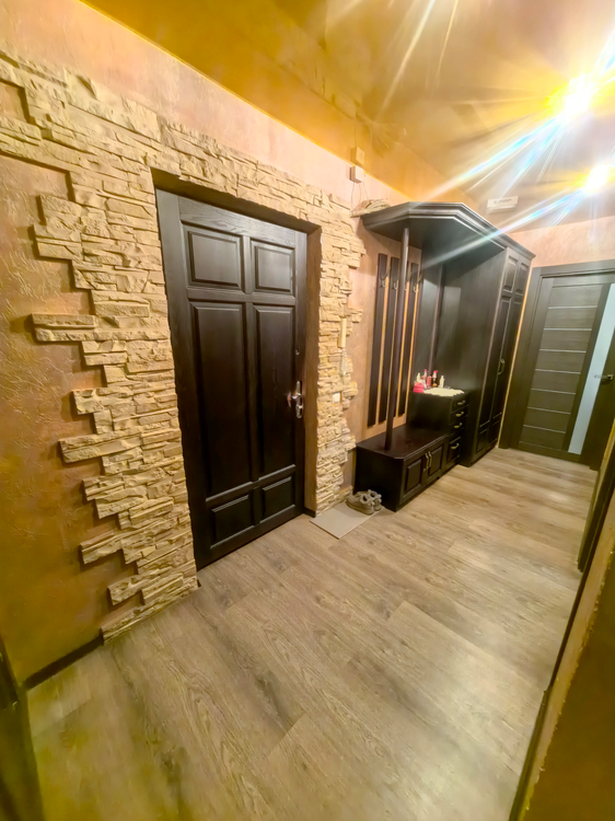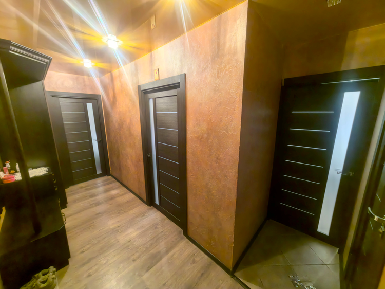 Стены выровнены, покрыты декоративной штукатуркой (в коридоре, кухни).