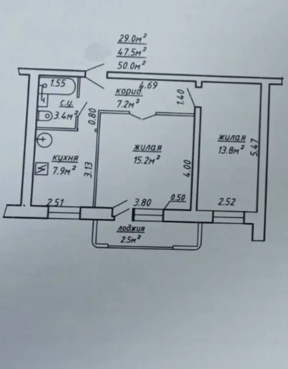 Продаётся двухкомнатная квартира в Витебске, по адресу: Московский проспект, дом 43. Общая площадь квартиры составляет 50 кв.м, из них 29 кв.м — жилая площадь, а кухня занимает 6.7 кв.м.